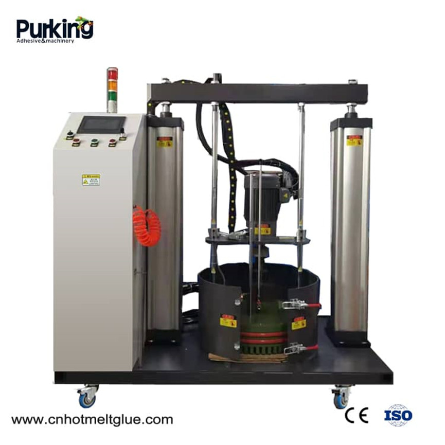 Pour nettoyer le fondoir en vrac PUR, vous devez acheter un agent nettoyant spécial pour fondoir en vrac PUR. Versez l'agent de nettoyage dans le fût vide du fondoir en vrac PUR, puis installez-le sur le fondoir en vrac PUR. Allumez la machine et chauffez-la à environ 130 degrés, puis déchargez l'agent de nettoyage à travers le pistolet à colle. De cette manière, l'adhésif thermofusible résiduel et le carbure dans la machine seront déchargés.